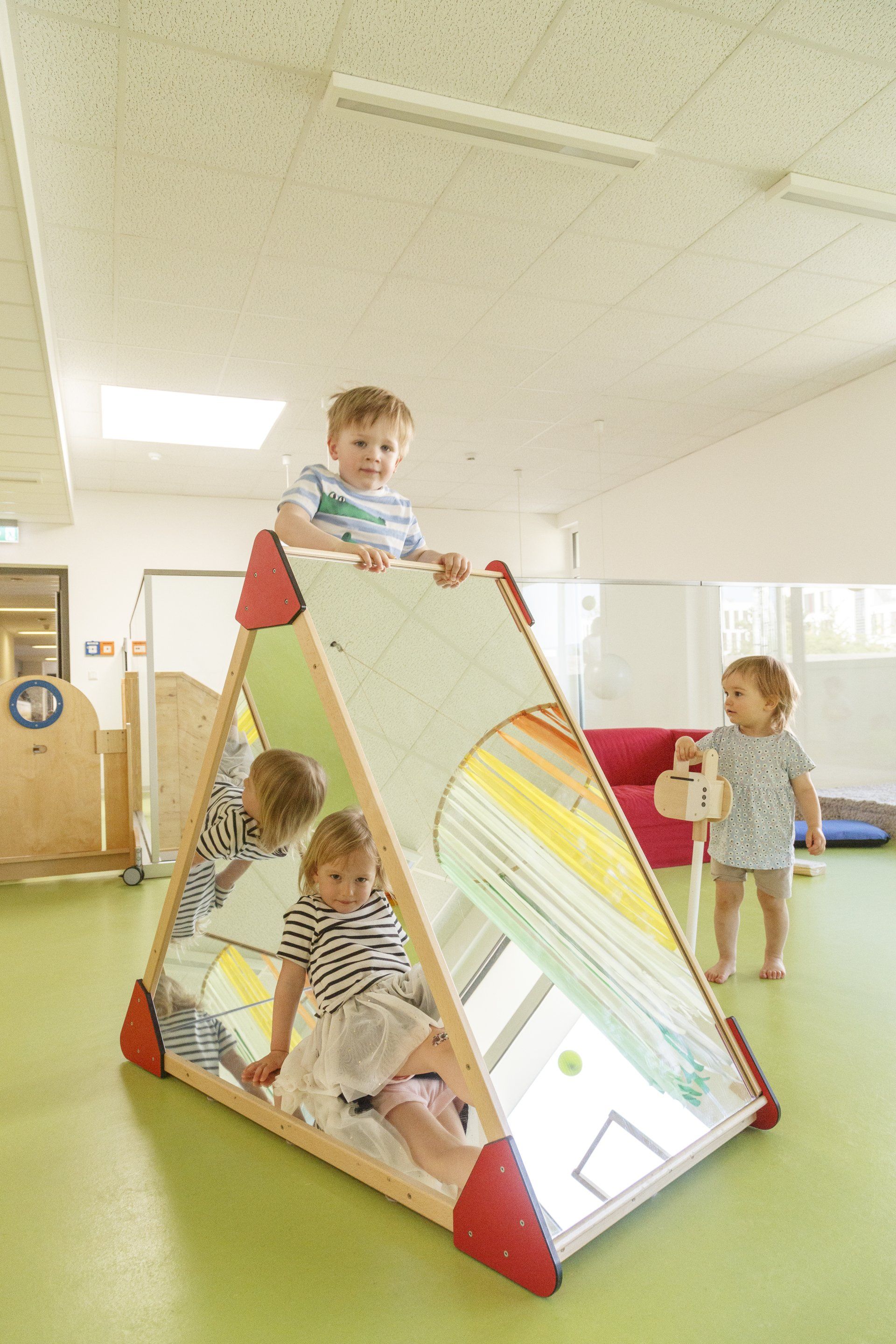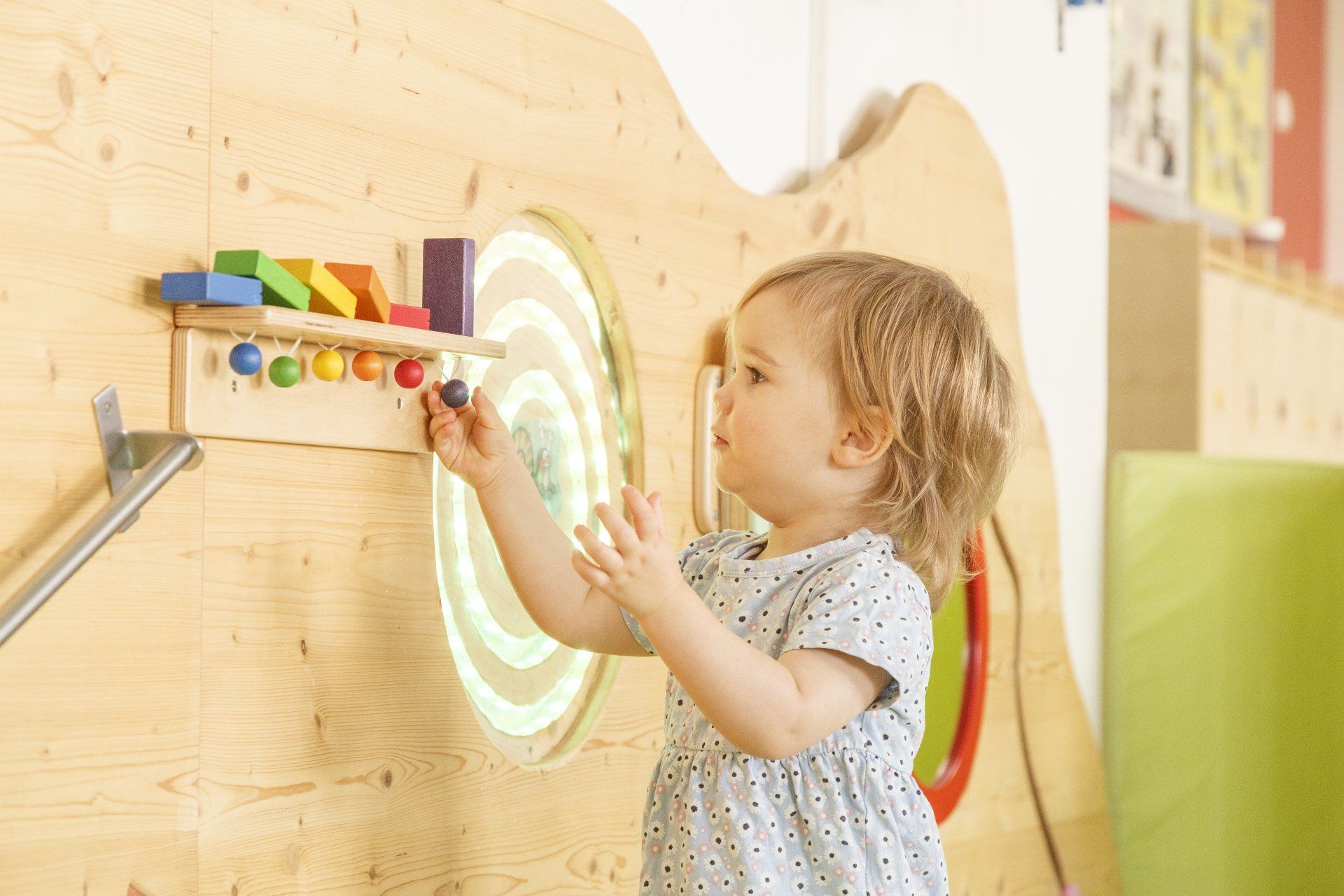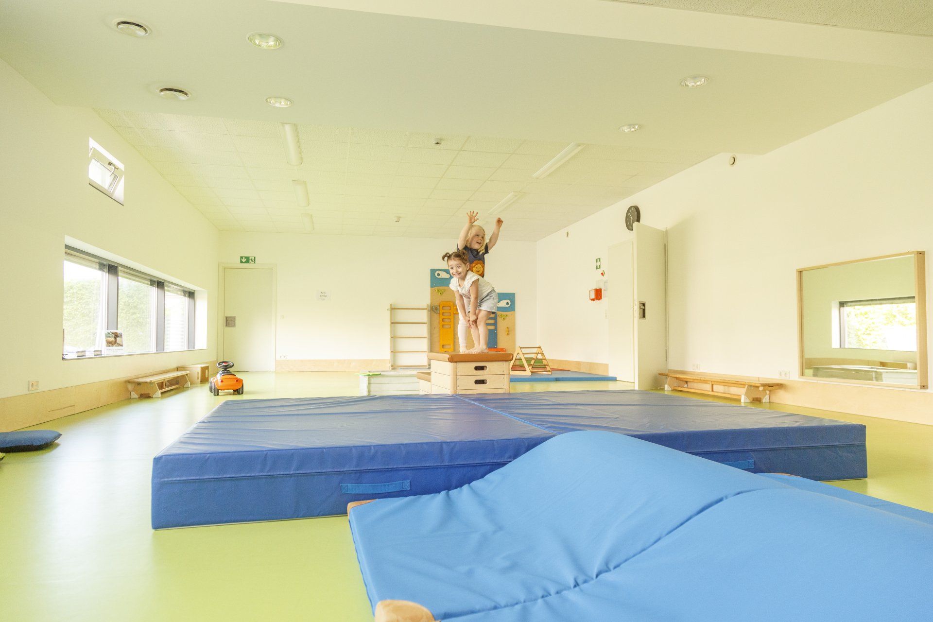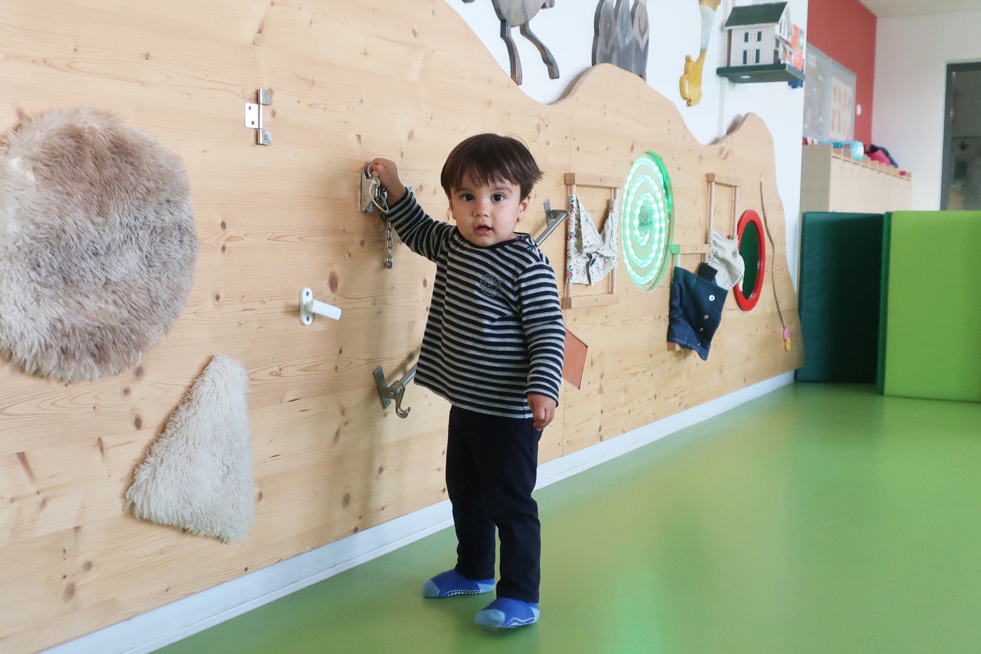 Die integrierten zweiten Ebenen, deren Gestaltung sich auf den Namen der jeweiligen Gruppe bezieht, bieten Raum zum Bewegen und Klettern. Im unteren Bereich befinden sich Nischen, in denen sich Ihr Kind verstecken oder zurückziehen kann. Der Turnraum lädt zum Spielen ein: Bewegungsbaustellen fördern die Motorik der Kinder, kleine Laufräder animieren dazu, den Gleichgewichtsinn auszuprobieren, mit Schaumstoffbausteinen kann kreativ gebaut werden. Die Wand der Galerie im ersten Stock bietet zusätzliche Tast- und Experimentiermöglichkeiten, und eine blubbernde Wassersäule bietet Raum zum Entspannen.