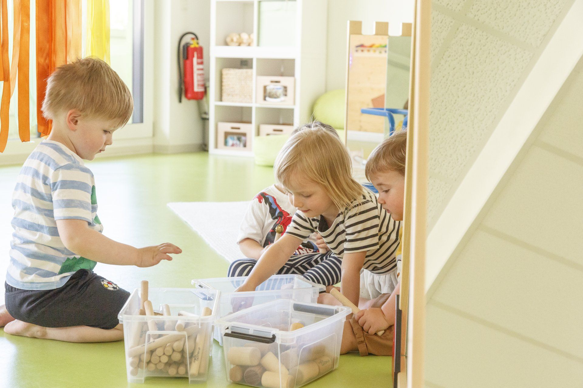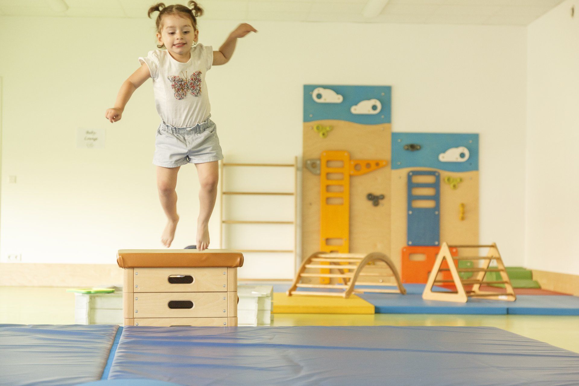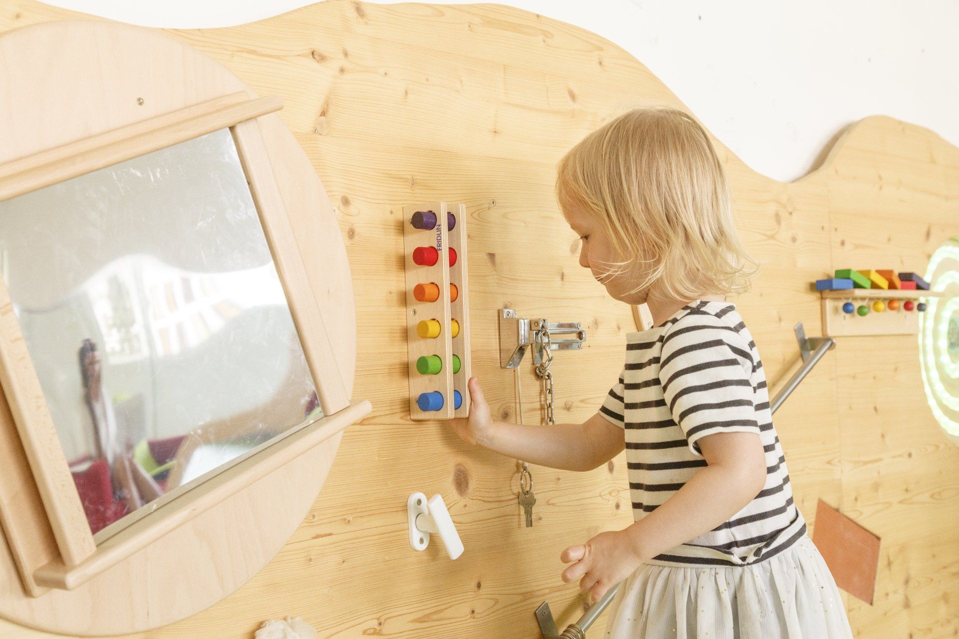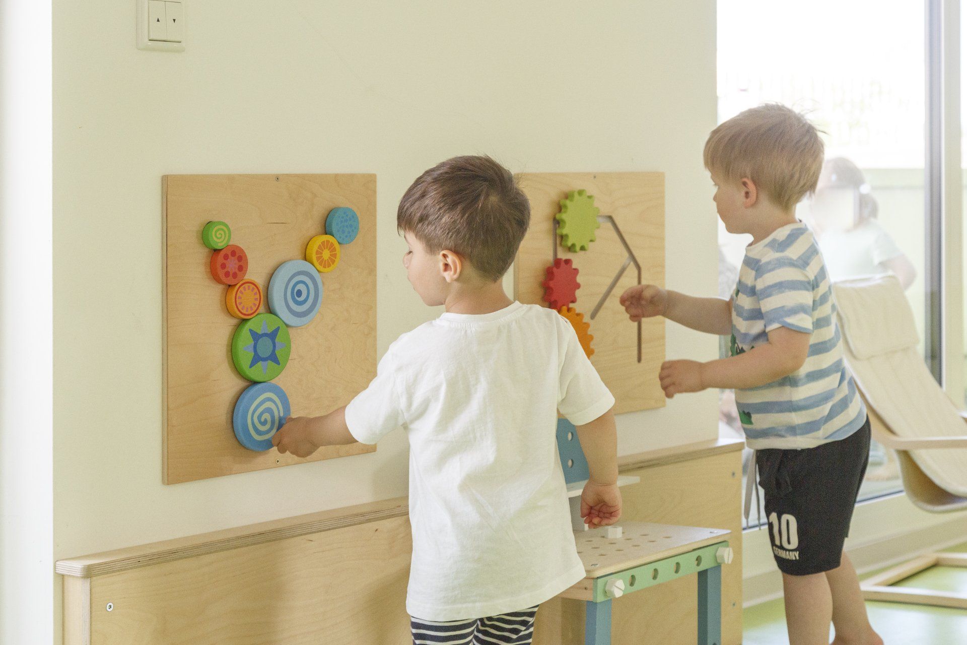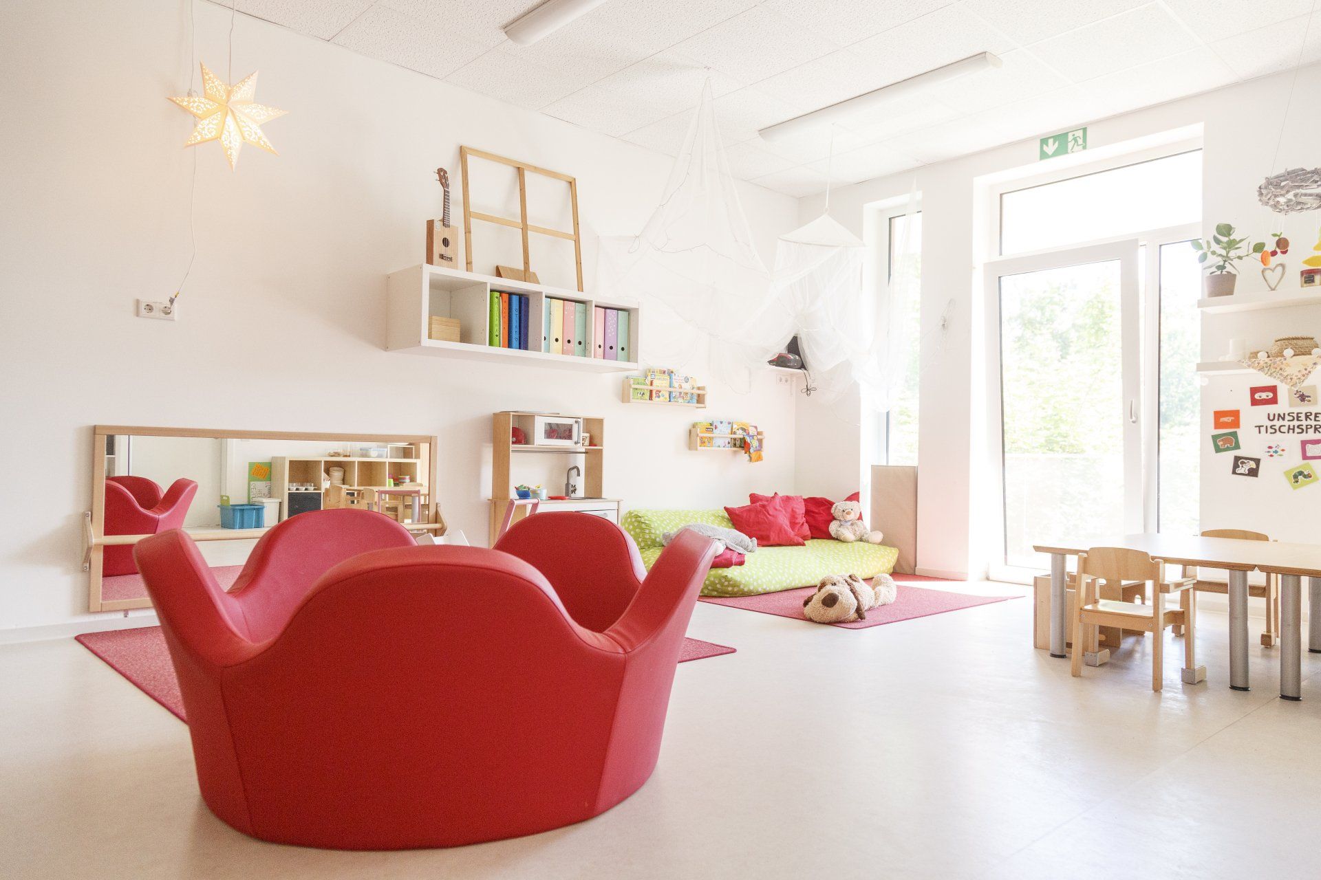 Die integrierten zweiten Ebenen, deren Gestaltung sich auf den Namen der jeweiligen Gruppe bezieht, bieten Raum zum Bewegen und Klettern. Im unteren Bereich befinden sich Nischen, in denen sich Ihr Kind verstecken oder zurückziehen kann. Der Turnraum lädt zum Spielen ein: Bewegungsbaustellen fördern die Motorik der Kinder, kleine Laufräder animieren dazu, den Gleichgewichtsinn auszuprobieren, mit Schaumstoffbausteinen kann kreativ gebaut werden. Die Wand der Galerie im ersten Stock bietet zusätzliche Tast- und Experimentiermöglichkeiten, und eine blubbernde Wassersäule bietet Raum zum Entspannen.