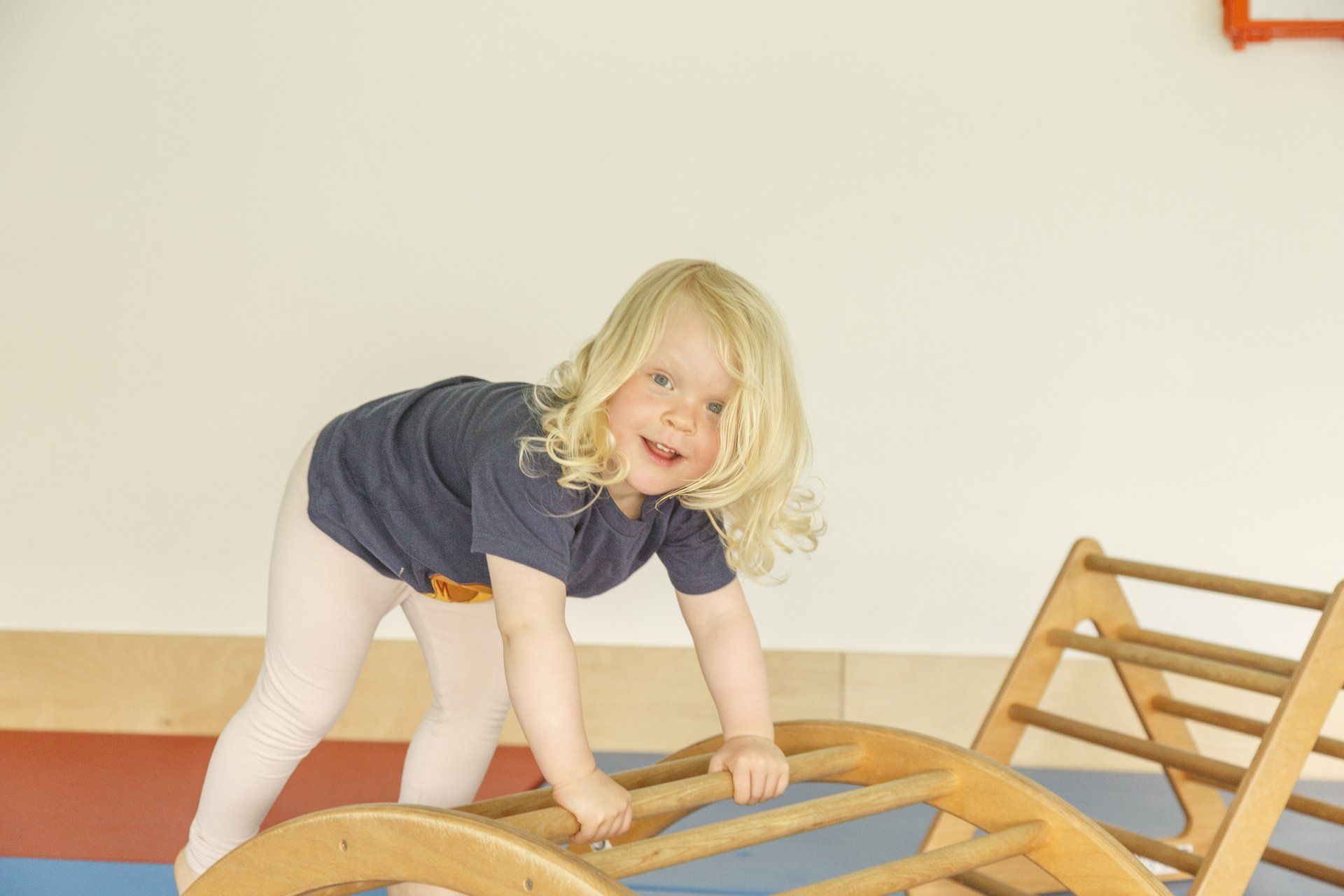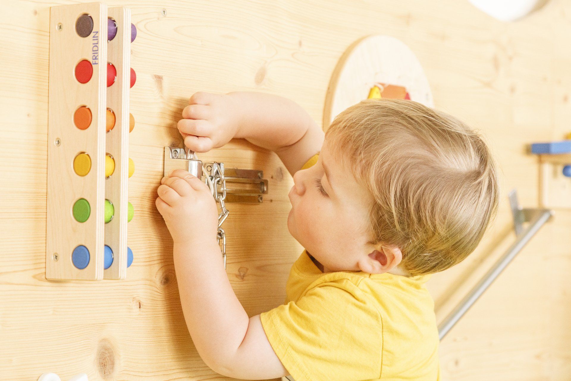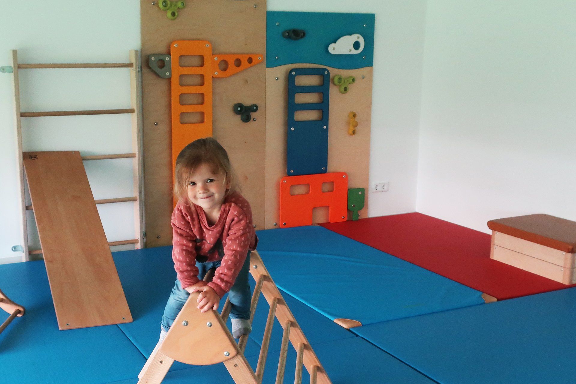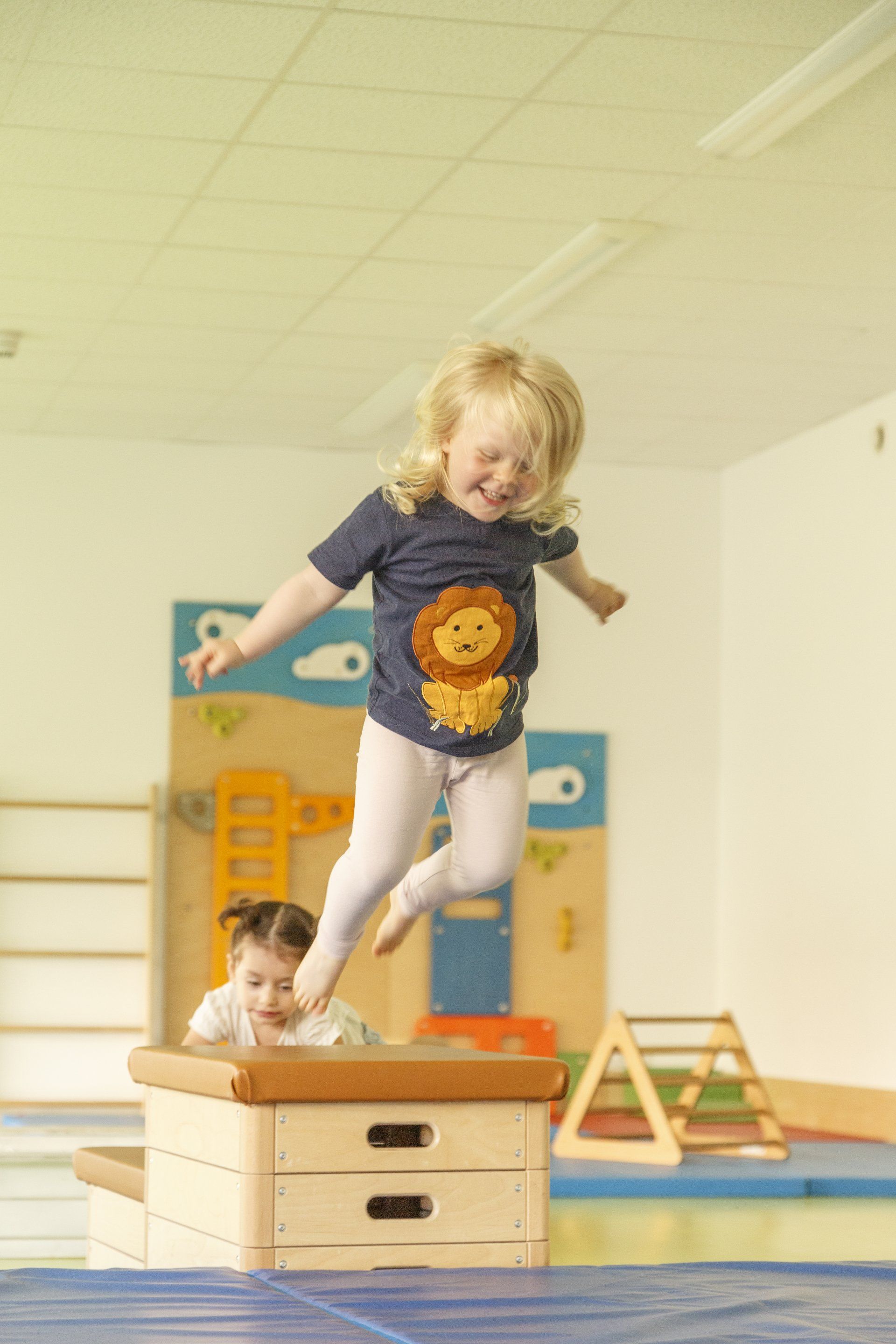 Die integrierten zweiten Ebenen, deren Gestaltung sich auf den Namen der jeweiligen Gruppe bezieht, bieten Raum zum Bewegen und Klettern. Im unteren Bereich befinden sich Nischen, in denen sich Ihr Kind verstecken oder zurückziehen kann. Der Turnraum lädt zum Spielen ein: Bewegungsbaustellen fördern die Motorik der Kinder, kleine Laufräder animieren dazu, den Gleichgewichtsinn auszuprobieren, mit Schaumstoffbausteinen kann kreativ gebaut werden. Die Wand der Galerie im ersten Stock bietet zusätzliche Tast- und Experimentiermöglichkeiten, und eine blubbernde Wassersäule bietet Raum zum Entspannen.