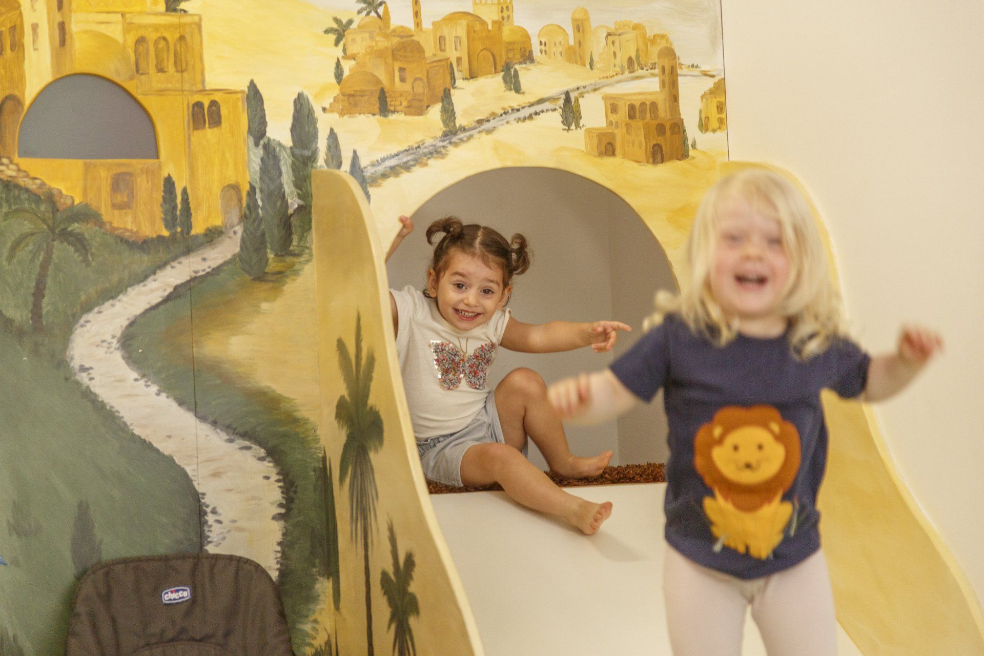Der Neubau bietet neben großzügig geschnittenen Gruppenräumen mit den Namen Äffchen, Aladin, Erdmännchen, kleiner Muck, Lampengeister, Morgenland, Schatzhöhle, Wüstenmäuse und Zauberdrachen viel Platz im Turnraum oder auf dem Außengelände.