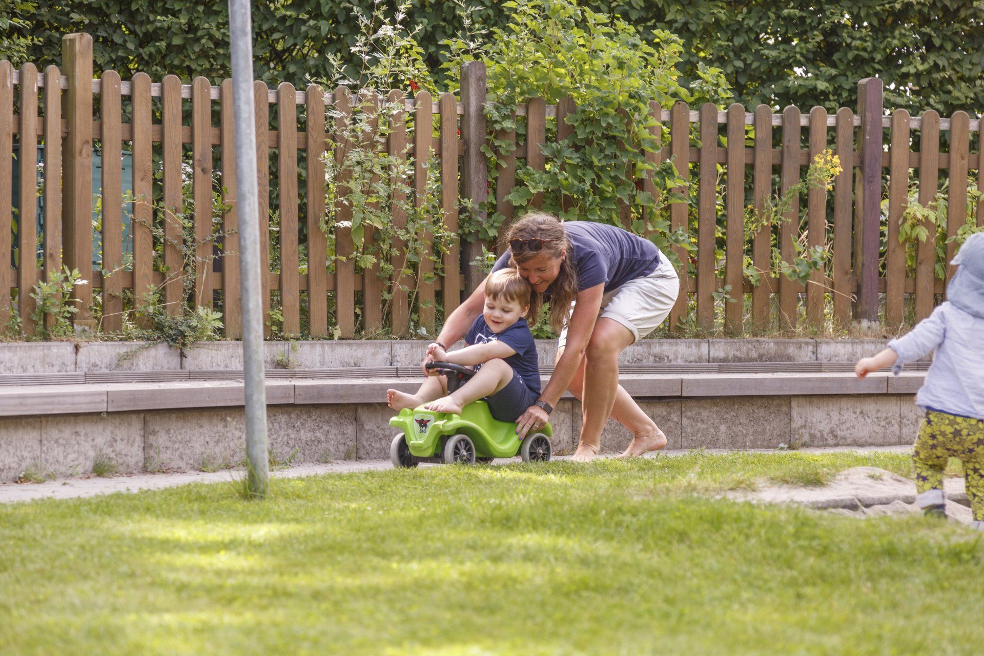 Im Garten befinden sich eine Bobbycar-Bahn, eine kleine Rutsche, vier Schaukeln, die Wippe „Fliegender Teppich“ und zwei Sandkästen. Vor der Sonne werden die Kinder durch drei große Sonnensegel geschützt. Im Vordergarten erfreut eine Vogelnestschaukel die Kinder.