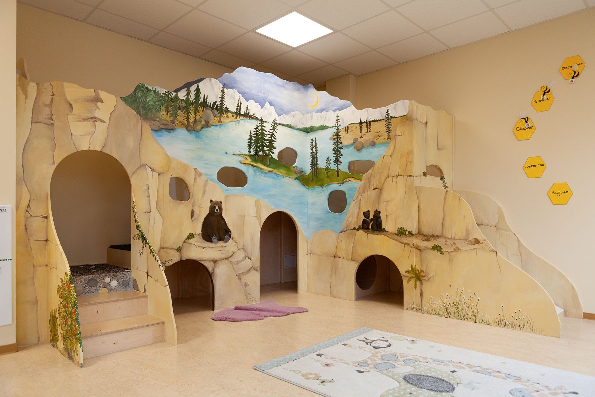 Bis zu 60 Kinder können hier ganztags von 7:00 bis 17.00 Uhr betreut werden. Die Kinder erwartet eine großzügige Kita mit fünf Gruppenräumen, an die jeweils ein eigener Schlaf- und WC-Bereich angrenzt. Ein großer Mehrzweckraum zum Toben, ein Geschichtenraum zum Eintauchen in Märchen, ein Kreativraum, indem Projekte über mehrere Tage entstehen, die Kinderküche und zwei Planschräume zum Experimentieren mit dem Element Wasser stehen den Kindern in Eschborn zur Verfügung. Außerdem verfügt die Einrichtung über 2 große Spielnischen, die individuell genutzt werden können. Direkt vor unserer Einrichtung haben wir einen neuen Außenspielbereich. Dort können die Kinder in zwei großen Sandkästen verschiedene Klettergerüste und Rutschen ausprobieren und im Hochbeet Obst und Gemüse einpflanzen, ernten und probieren.