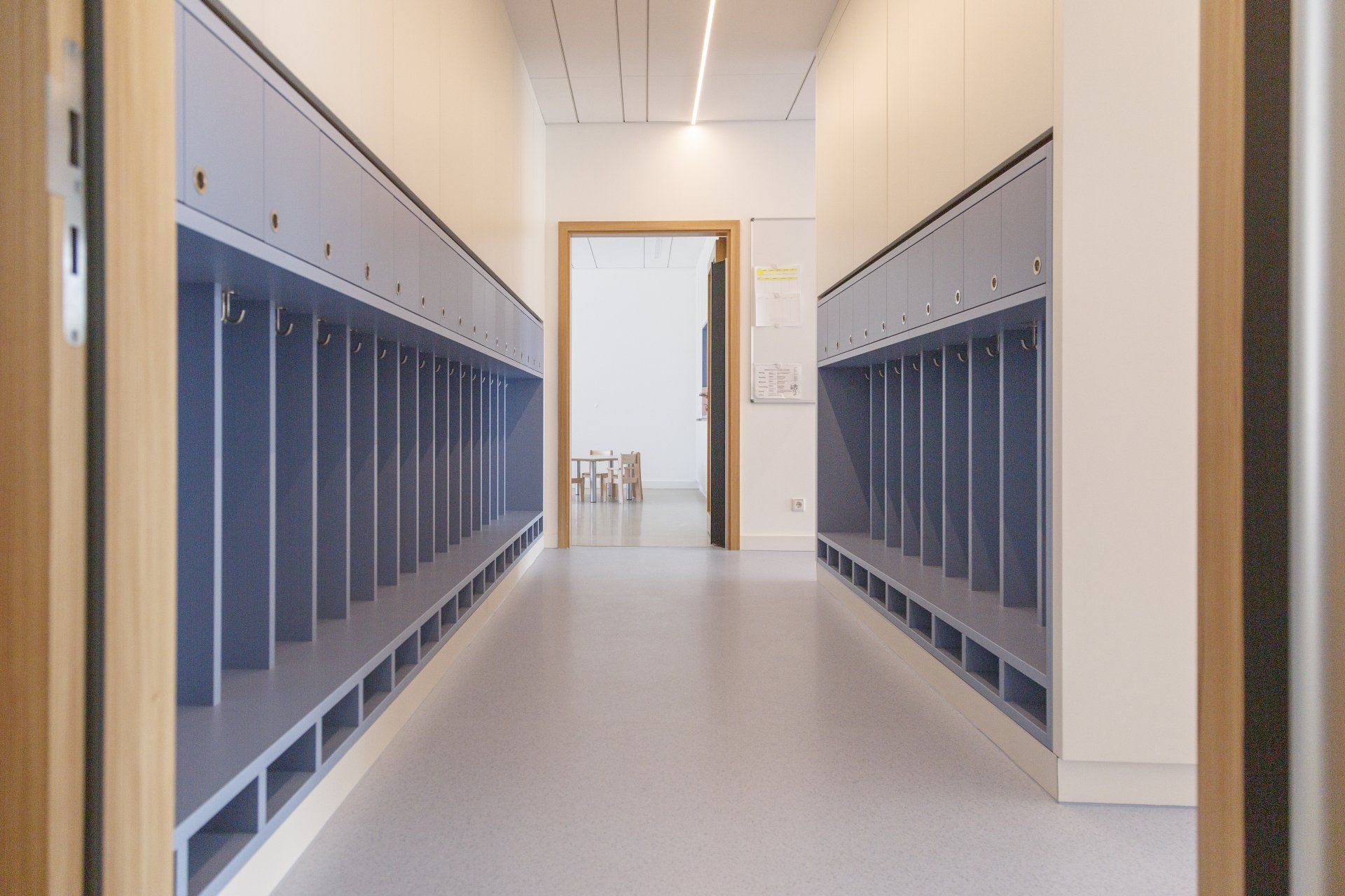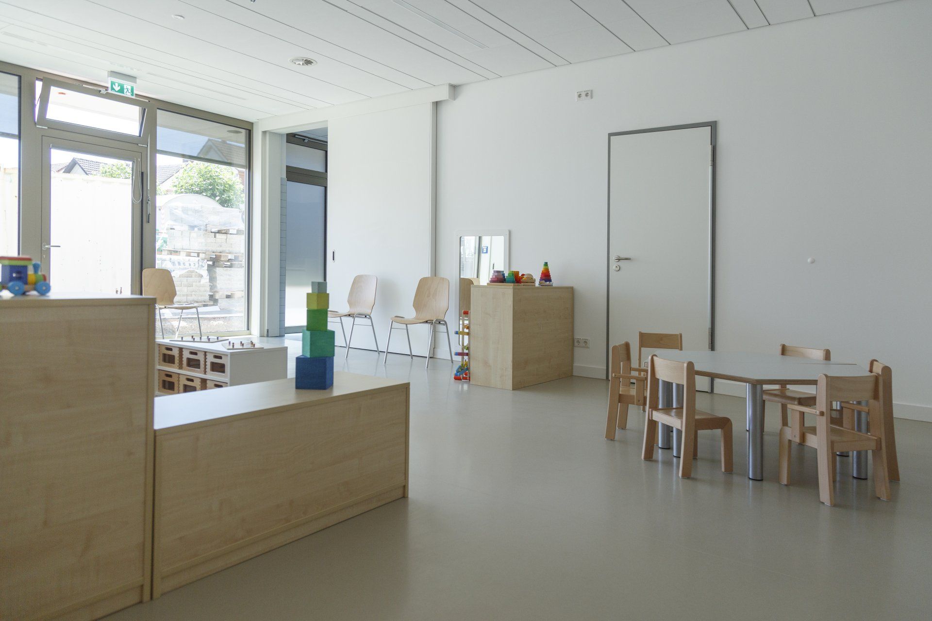 Unsere Einrichtung bietet große und lichtdurchflutete Räumlichkeiten. An jeden der vier Gruppenräume sind jeweils ein Kinderbad sowie Schlaf- bzw. Funktionsräume angeschlossen. Des Weiteren verfügt die Einrichtung über einen großen Bewegungsraum sowie ein Atelier, in dem die Kinder Kreativ-, Motorik- und Fördermöglichkeiten nachgehen und erste Sinneserfahrungen sammeln können.