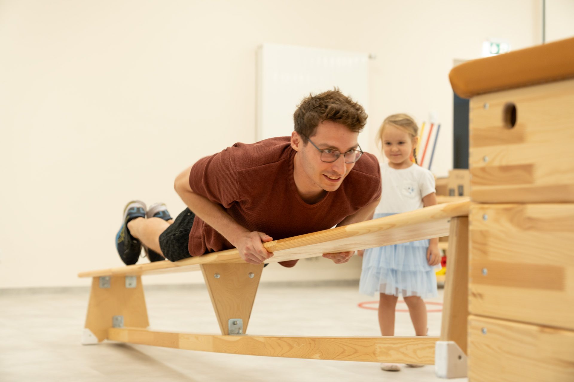 Die beiden Gruppenräume, der Westflügel und der Ostflügel, befinden sich in der unteren Etage des Hauses. In jeder Gruppe gibt es eine Hochebene, die sowohl zusätzliche Spielfläche als auch eine Rückzugsmöglichkeit für die Kinder bietet.