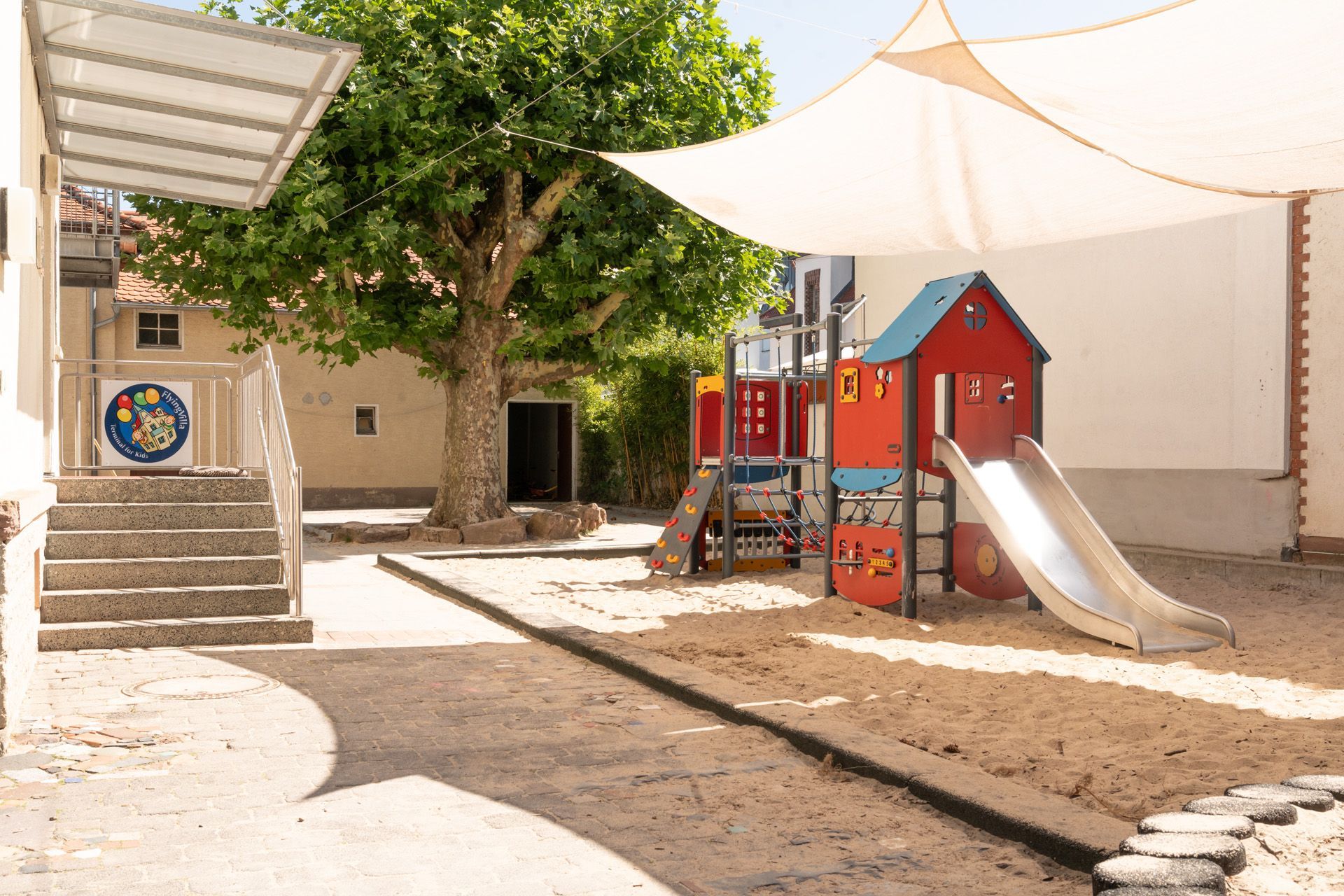 Die Kindertagesstätte FlyingVilla befindet sich in einem ruhigen Wohngebiet der Stadt Kelsterbach. Bei schönem Wetter kann man auf den Main schauen und die Schifffahrt beobachten. Das Außengelände ist in verschiedene Bereiche aufgeteilt. Es bietet sowohl Platz für fußballbegeisterte als auch für kletterfreudige Kinder. Ruhige Spielbereiche bieten Ihrem Kind Rückzugsmöglichkeiten.