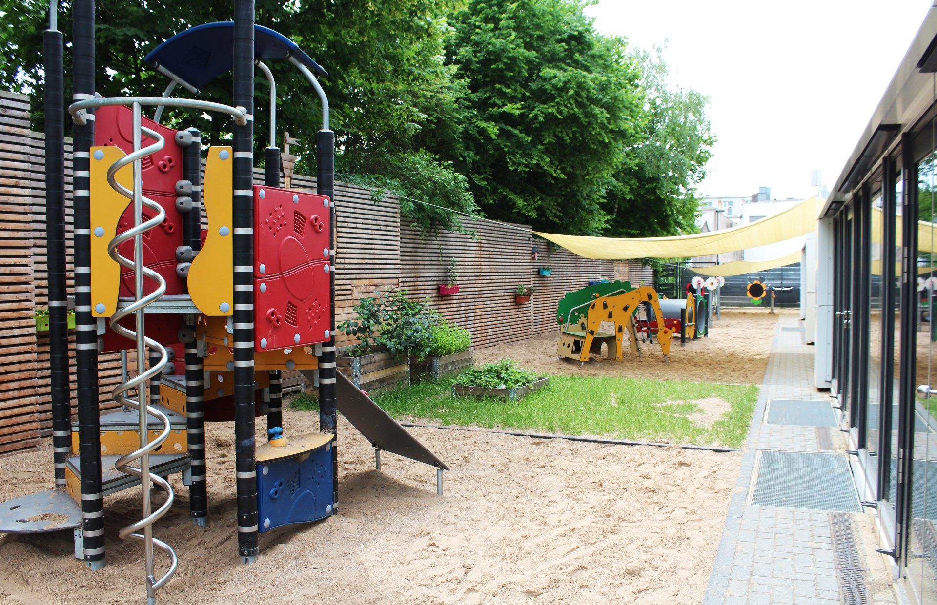 Im Erdgeschoss befindet sich die dreigruppige Kita, die 15 Krippen- und 30 Kindergartenkindern im Alter von vier Monaten bis zum Schuleintritt offen steht. In der Krippen-, der altersgemischten und der Elementargruppe finden alle Kinder genügend und abwechslungsreichen Raum, um sich zu entwickeln.