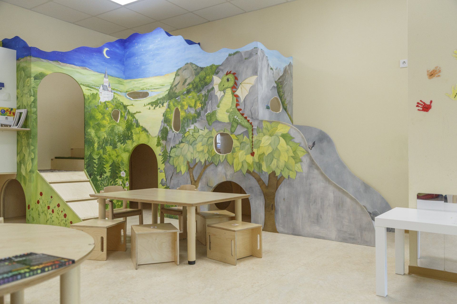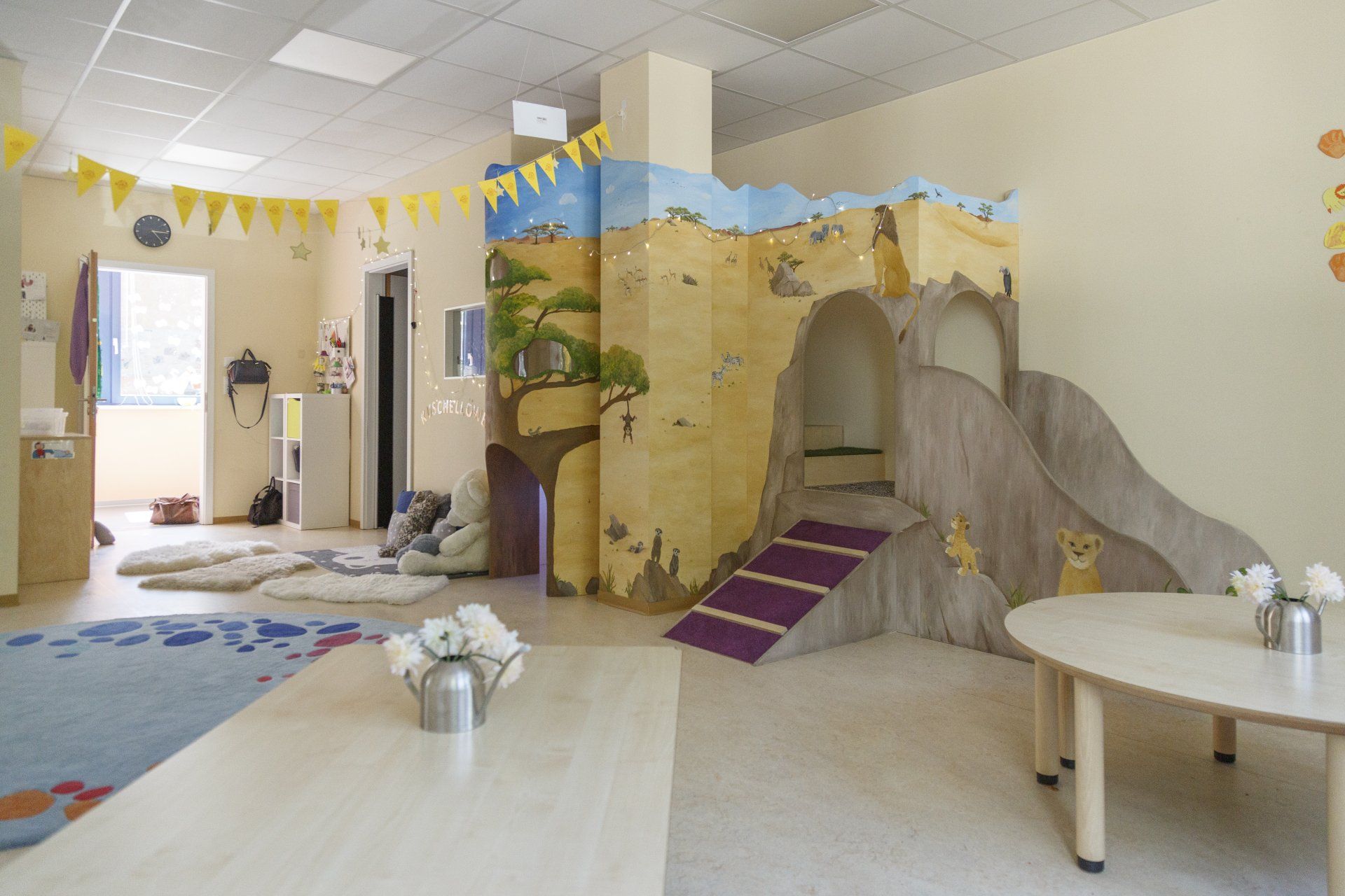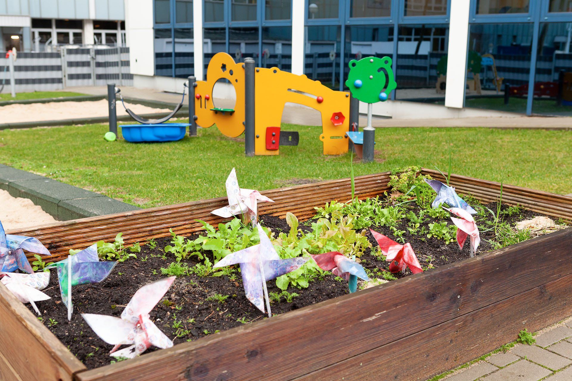 Bis zu 60 Kinder können hier ganztags von 7:00 bis 17.00 Uhr betreut werden. Die Kinder erwartet eine großzügige Kita mit fünf Gruppenräumen, an die jeweils ein eigener Schlaf- und WC-Bereich angrenzt. Ein großer Mehrzweckraum zum Toben, ein Geschichtenraum zum Eintauchen in Märchen, ein Kreativraum, indem Projekte über mehrere Tage entstehen, die Kinderküche und zwei Planschräume zum Experimentieren mit dem Element Wasser stehen den Kindern in Eschborn zur Verfügung. Außerdem verfügt die Einrichtung über 2 große Spielnischen, die individuell genutzt werden können. Direkt vor unserer Einrichtung haben wir einen neuen Außenspielbereich. Dort können die Kinder in zwei großen Sandkästen verschiedene Klettergerüste und Rutschen ausprobieren und im Hochbeet Obst und Gemüse einpflanzen, ernten und probieren.